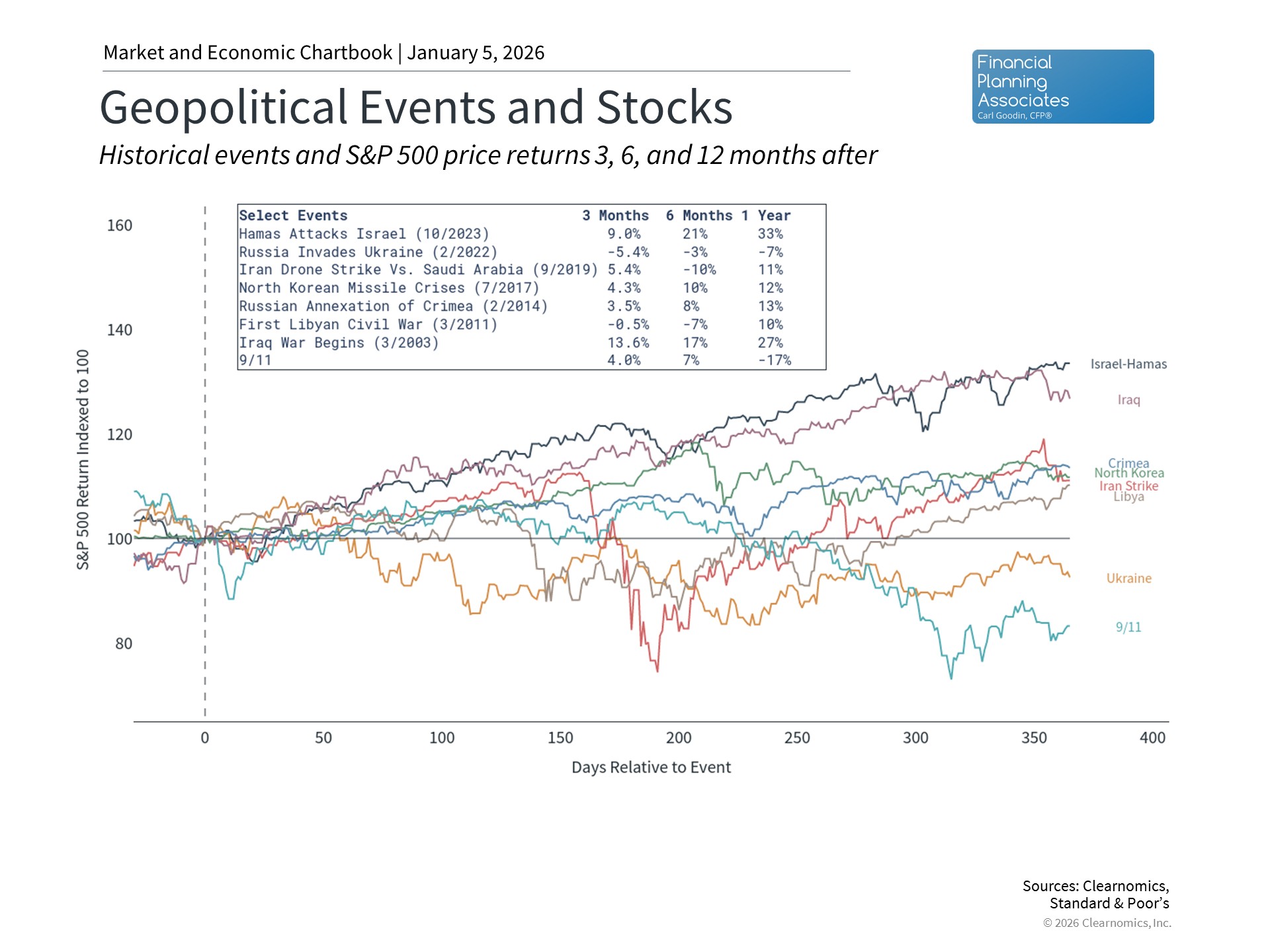 For long-term investors, the most important point is that geopolitical risk is a normal part of investing, even if the specific circumstances differ each time. These news stories may also feel more concerning since they differ from everyday business news about corporate earnings and economic data. The chart above highlights many significant geopolitical events over the past few decades. In most cases, markets recovered within weeks or months, if they were affected at all.